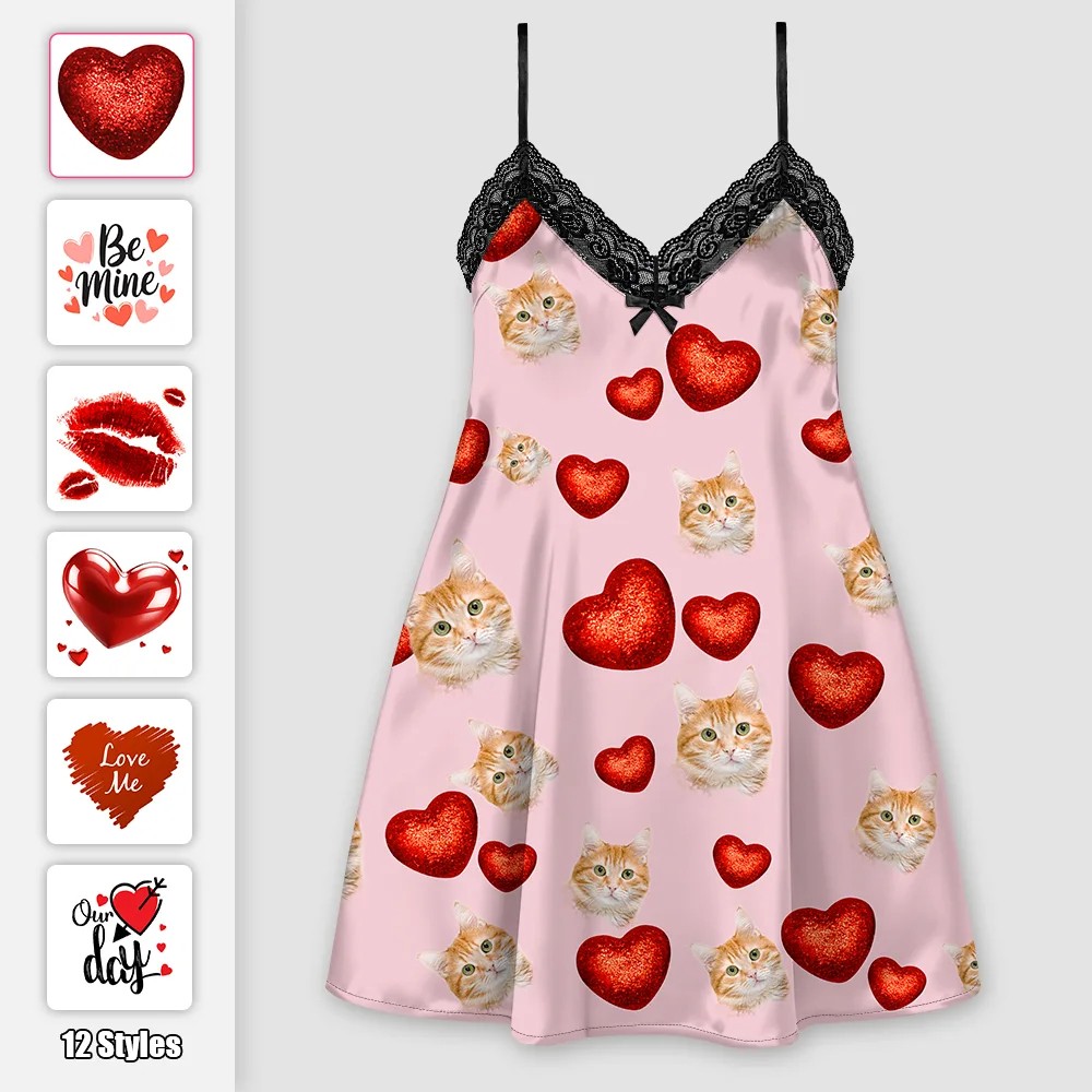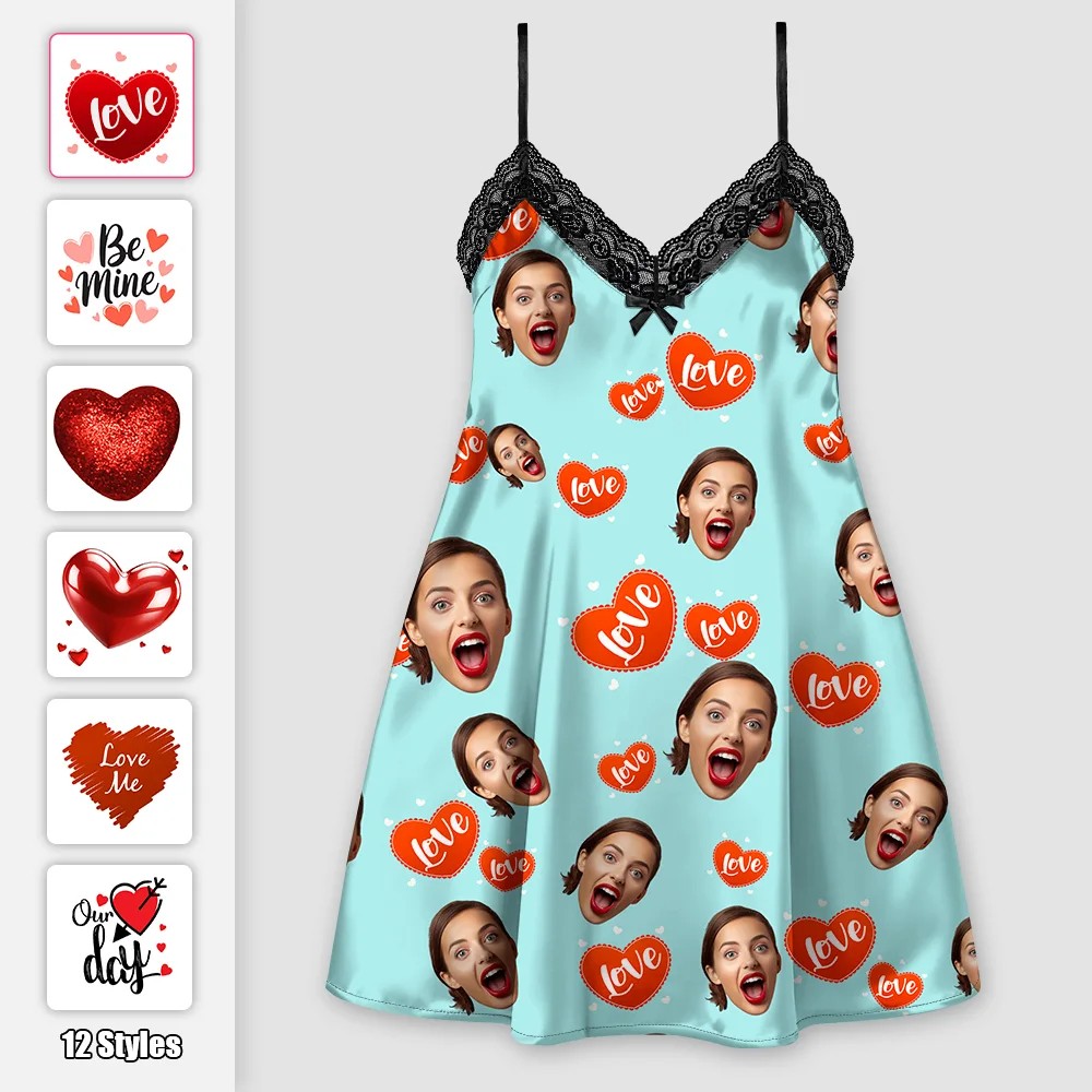 Custom Satin Lace Nightgown Red Glitter Heart Love Print Expressive Face Pattern Sleeveless Sleepwear Gift For Her Valentine's Day Gifts