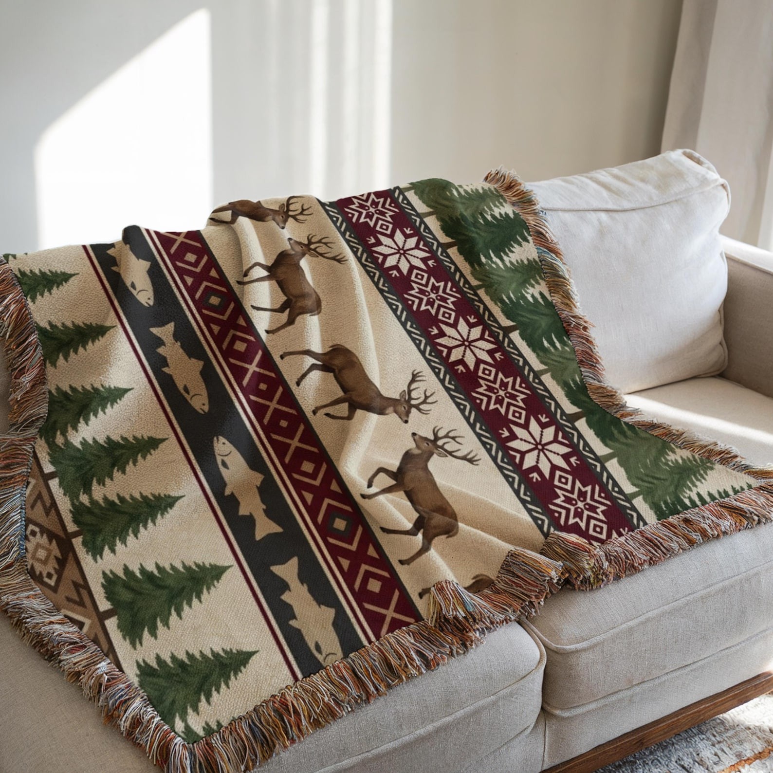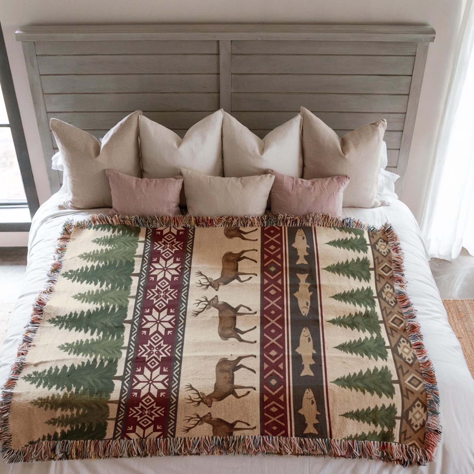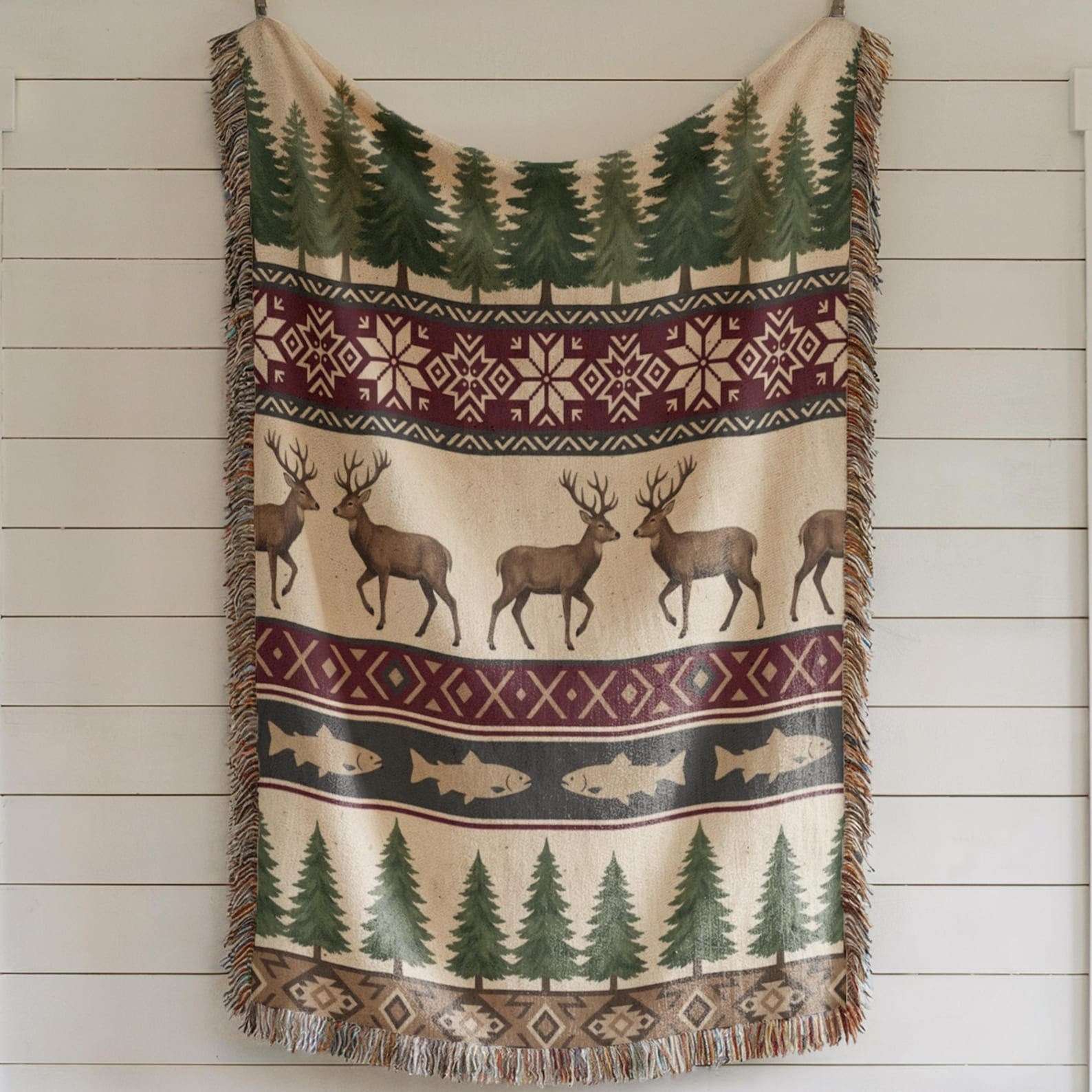 Rustic Cabin Woven Blanket – Deer, Fish & Pine Tree Lodge Throw
