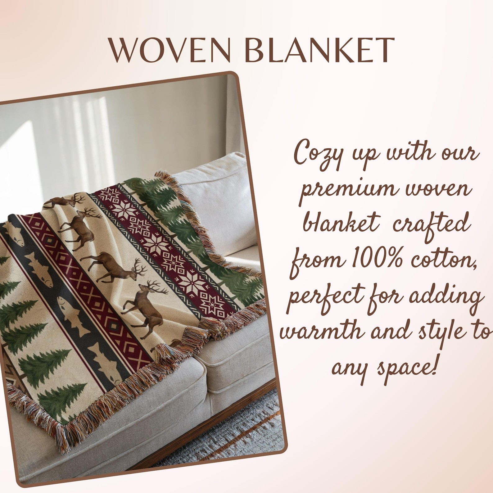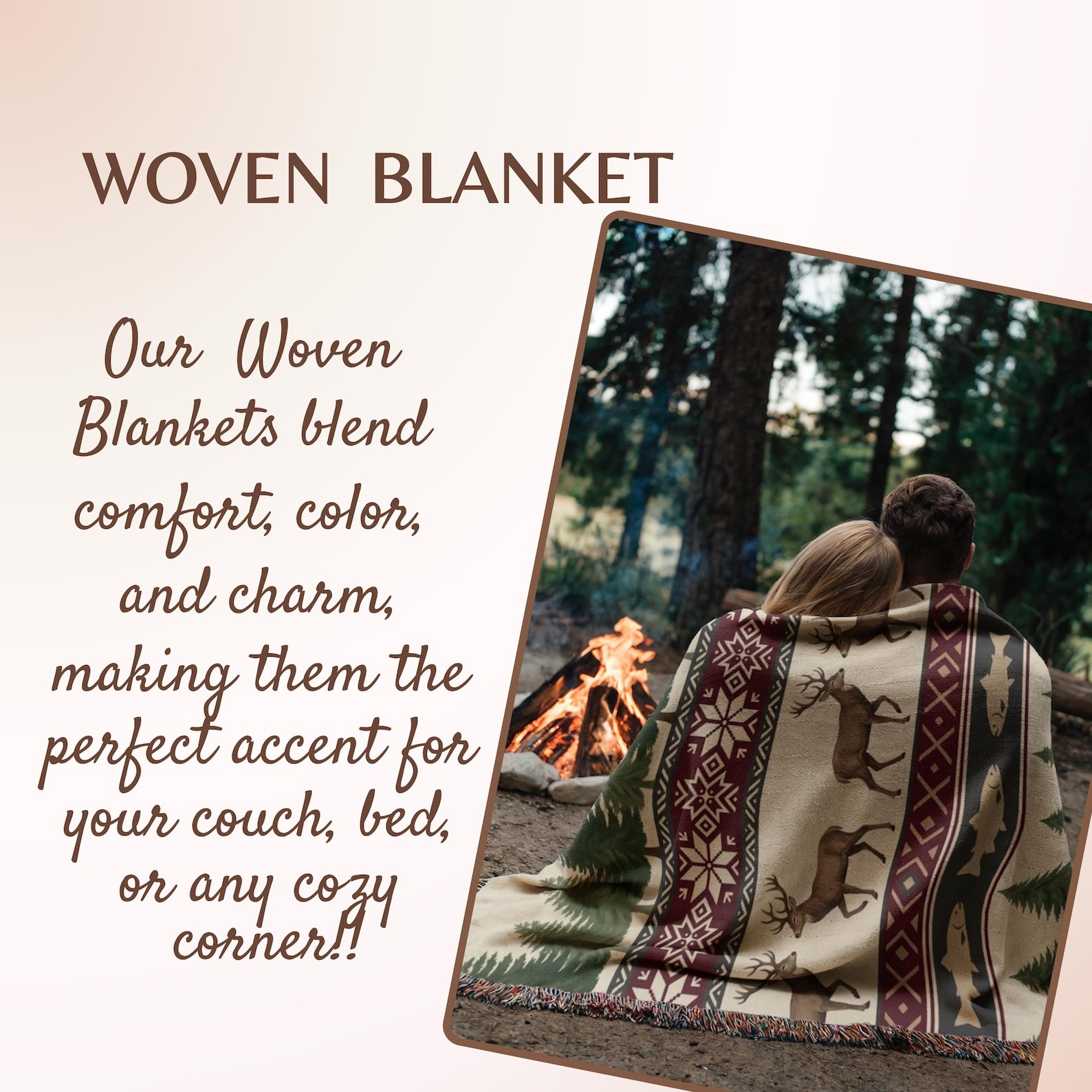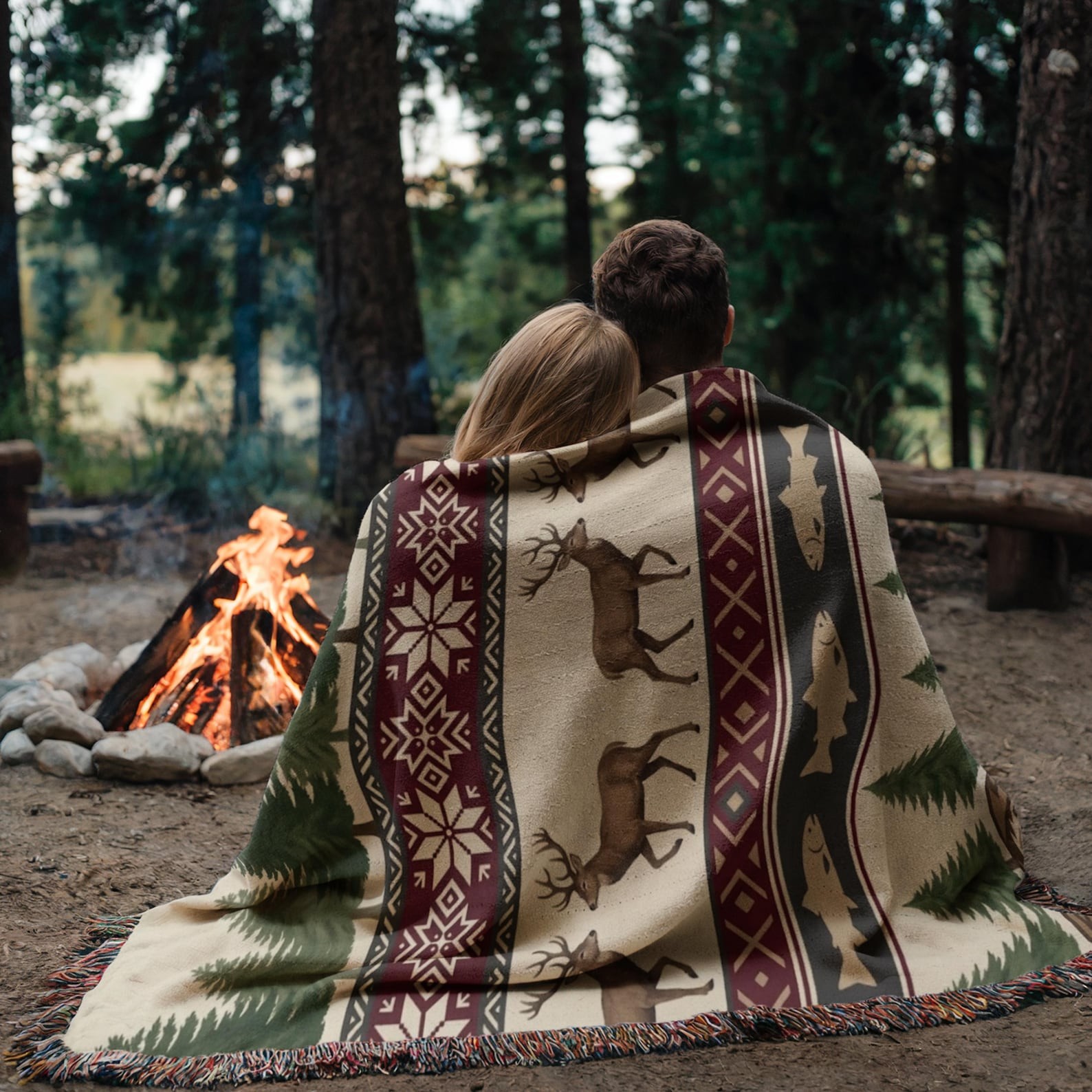 Rustic Cabin Woven Blanket – Deer, Fish & Pine Tree Lodge Throw