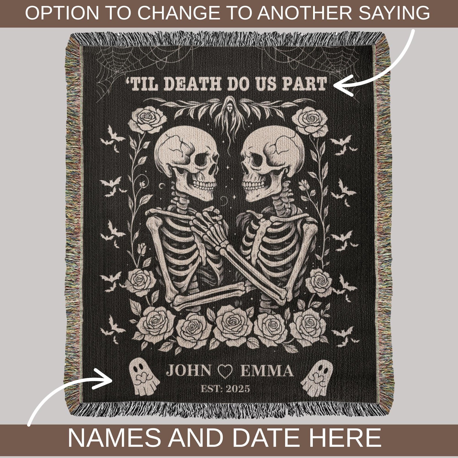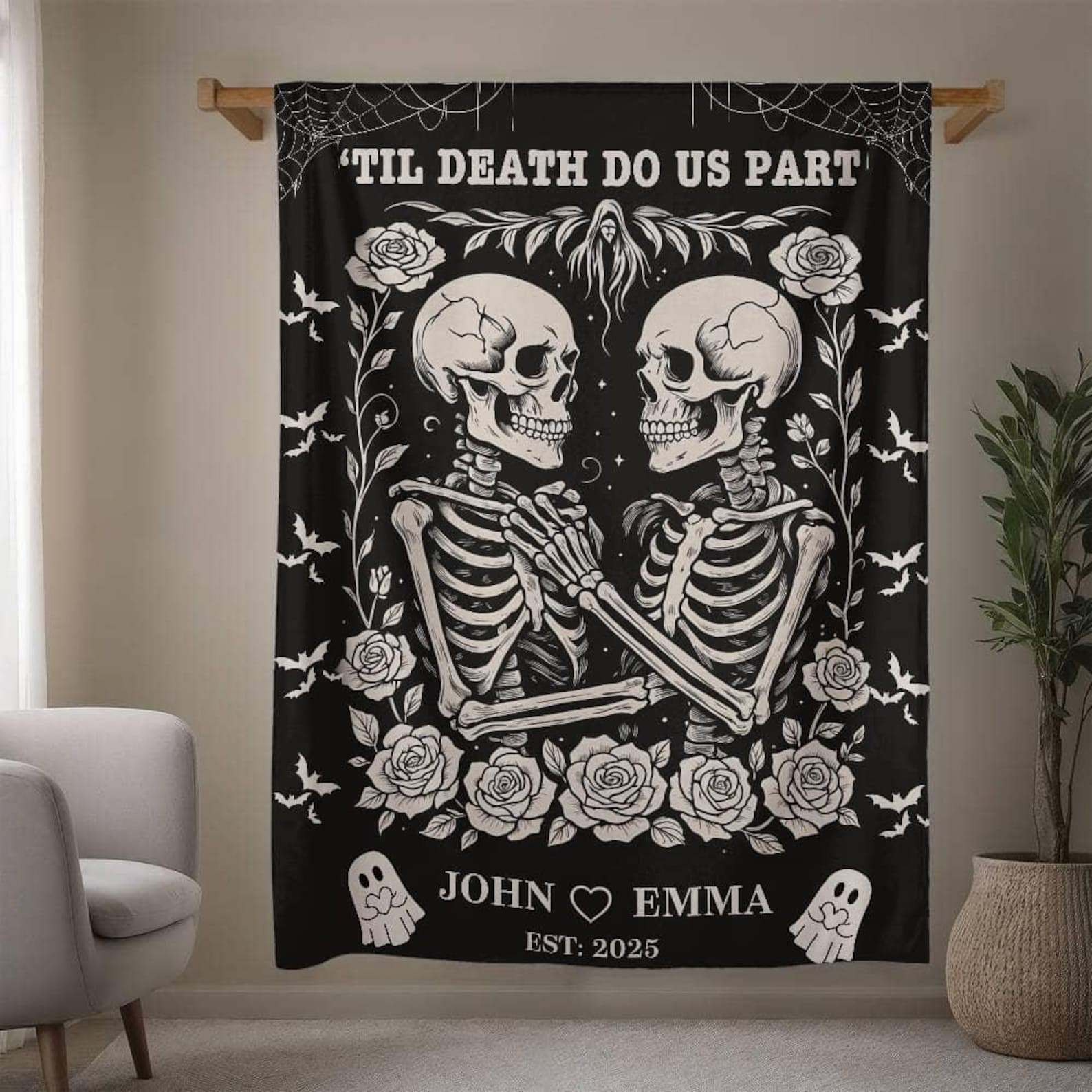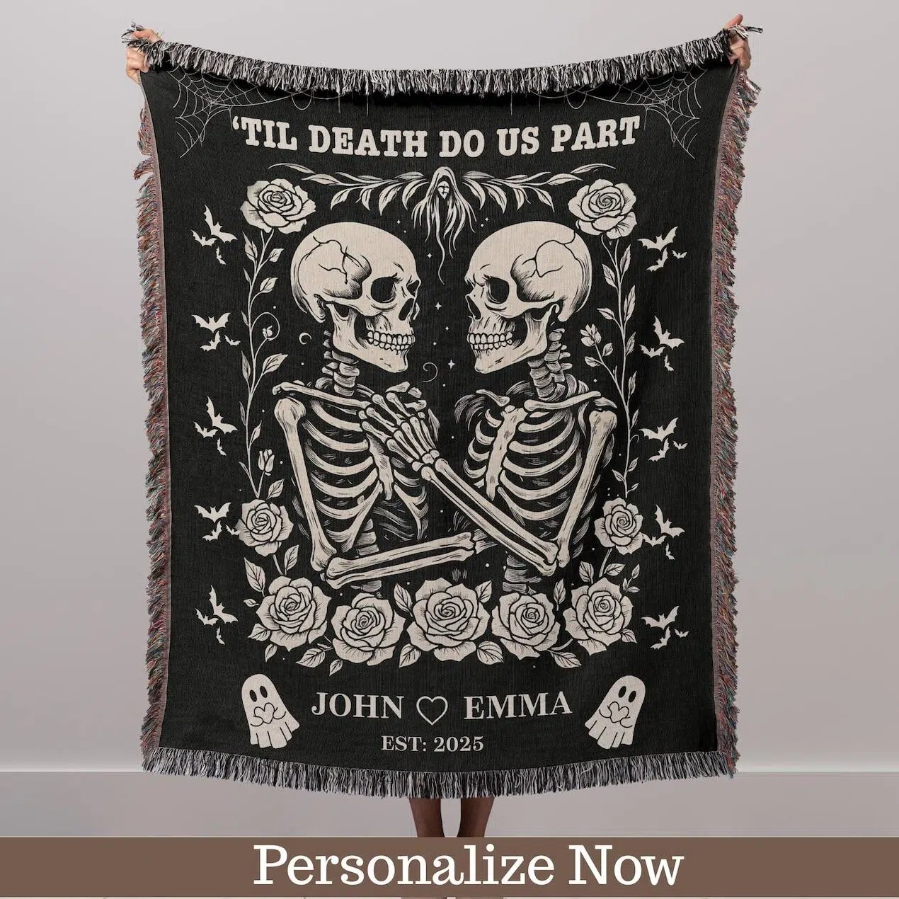 Celebrate everlasting love with our Personalized Skeleton Couple Blanket! This unique gothic wedding gift features a romantic skeleton lovers design, perfect for couples who love Halloween, spooky vibes, or gothic style. Personalize it with names, wedding dates, or a custom message to create a one-of-a-kind keepsake.
